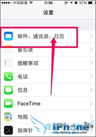 1、打开苹果iPhone6手机【设置】,点击【邮件、通讯录、日历】找到日历相关选项。