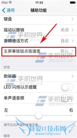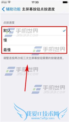 2)点击【主屏幕按钮点按速度】,选择【默认】一栏。(如下图)