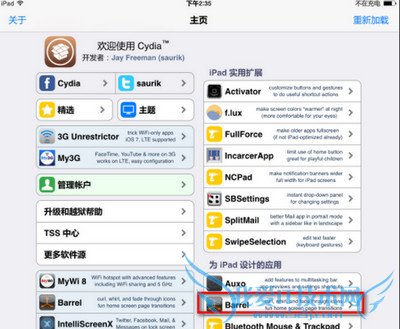 首先,使用的最广泛的——Barrel 插件,该插件最好找了,打开 Cydia 之后,首页右下键的专为 iPad 而设计的插件里面就有一个——Barrel(如下图所示),大家直接添加即可。