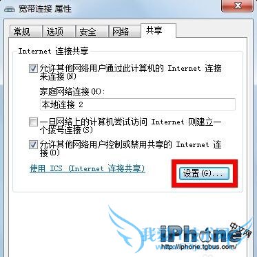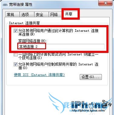 如图,选择“共享”,勾选“允许其他……连接”,选择“本地连接 2”