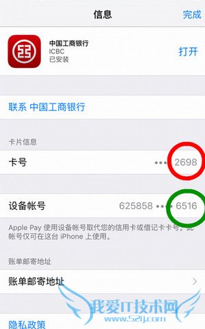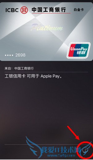 1、进入设备Wallet页面,点击已绑定的工行卡的卡面,然后点击右下角圆形感叹号按钮;