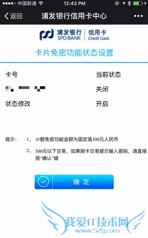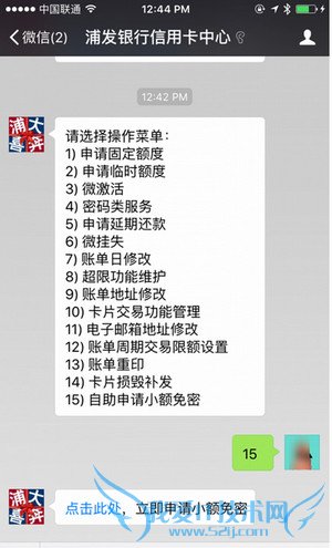 2、通过浦发微信号【浦发银行信用卡中心】开通:进入公众号之后点击【微服务-账户维护-自助申请小额免密】,确认开通即可。
