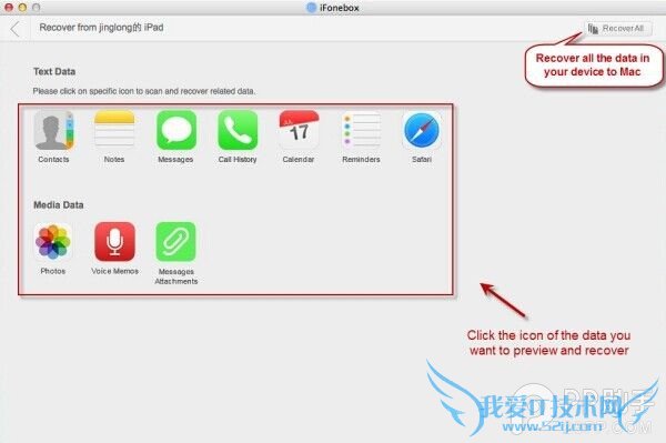 iFonebox for Mac 恢复软件支持恢复的数据非常多,比如 通讯录,信息,短信的附件,通话记录,备忘录,WhatsApp数据(他们是海外软件,所以有这个,国内人用的基本是微信),照片,图片,日历,提醒,录音,应用图片数据,我直接从他们网站上截图给大家看一下,看图标吧,他们是英文的。