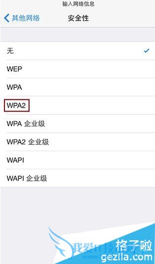 5.然后输入无线网络的WiFi名称,选择“安全性”,如上文所述,这里可以选择WPA也可以选择WPA2,为了安全,推荐选择WPA2。在iPhone上,WPA和WPA2实际上是指的WPA-PSK和WPA2-PSK,PSK意思是个人共享密钥,也就是常说的“WPA 个人”和“WPA2 个人”,这是为了与企业级认证相对应的说法。安卓手机有WPA/WPA2混合安全性可选,但iPhone是没有的,所以在设置iPhone之前,您需要精确的知道路由器设置的安全性方式。