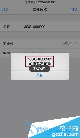 7.如果安全性选择错误或者密码输入不正确,iPhone会给出错误提示,这样您需要重新选择正确的安全性并且输入正确的WiFi密码才能再次尝试连接。