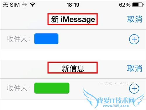 iOS5系统带来了iMessage功能,如果双方都打开了,则会自动发送iMessage,而不是发送普通的短信,节省短信费用。打开iMessage的收件人,会显示蓝色;没有打开的为绿色,如下图: