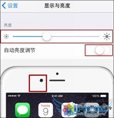 2、然后先关上“自动亮度调节”按钮,把亮度条滑块拖到最左,接着拿深色纸片/卡片/随便什么东西挡住听筒旁边的感光器(实测手指的遮光效果不佳),挡好后再打开自动调节按钮,大概过一秒的样子亮度条滑块就会自己向右移动了,屏幕也随之变亮。这就说明你的iPhone的光线感应功能没有问题,不需要为此忧心了。