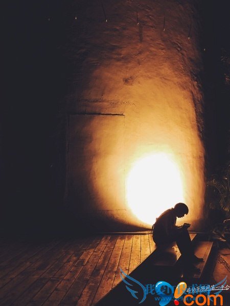 坐在路边的人。背后有一盏地灯,仿佛烛光中的人影。