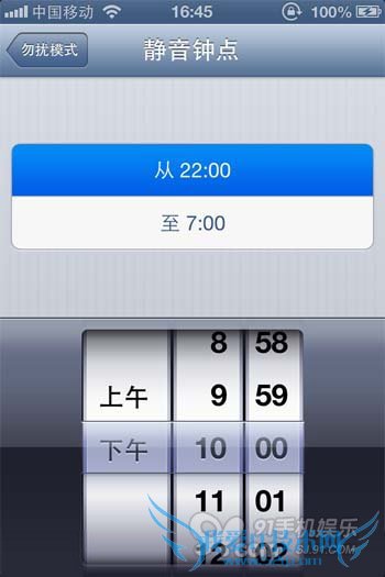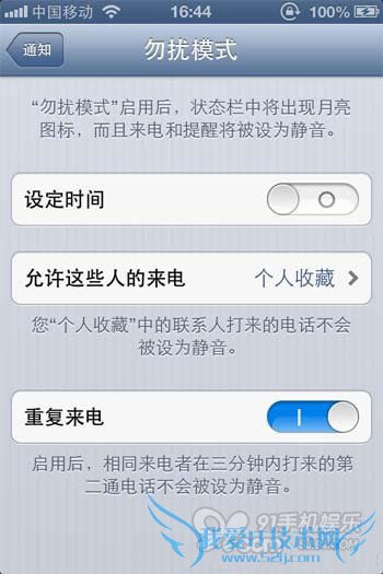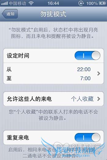 iOS6中的勿扰模式其实是一个很人性化的设置,和通知栏并属一起,也主要在【通知】的选项里面进行设置,点击通知进去后就可以看到【勿扰模式】的相关选项了。勿扰模式启用后将会在顶部的状态栏中出现月亮图标,而且来电和提醒将被设置为静音。