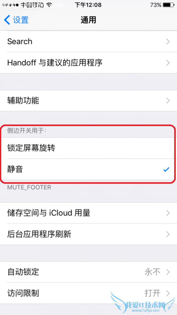 2、直接就有“侧边开关”实体键的功能设置。注意,有机型限制,适用于 iPhone 6/6 Plus 和 iPhone 6s/6s Plus。选项有“锁定屏幕旋转”和“静音”。