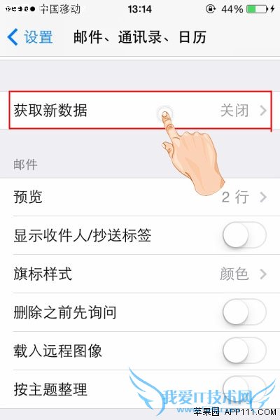 第二步,在“邮件、通讯录、日历”选项页面,关闭“获取新数据”功能。