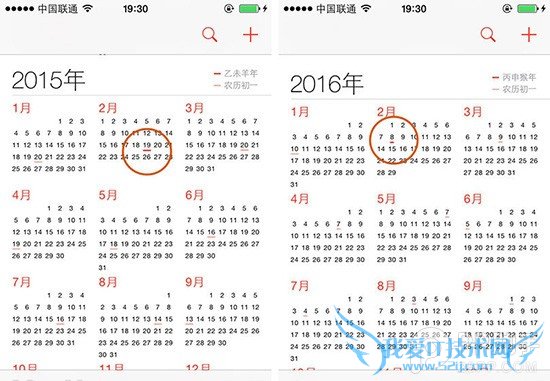 在年视图年份右侧,可以看到两个红线的标识。红色粗线为阴历年份指示,比如今年是甲午马年,而细线为农历初一。仔细查看整个年度的日历,可以看到很多日子下方都有红色细线,这些日子都是阴历初一。阴历正月初一就是新年,所以在年视图中,所有下面有红色粗线的都是当年的春节。通过这种方式,在年视图界面向下滑动可以方便而快速的查看未来几年究竟哪天是春节,比如2015年是2月19日,而2016年是2月8日,大家可以在下方截图的红色圆圈中查看。