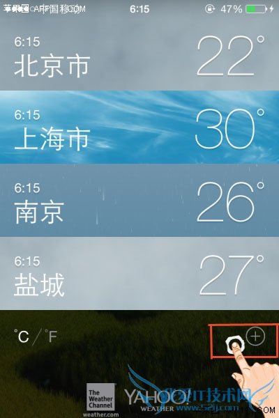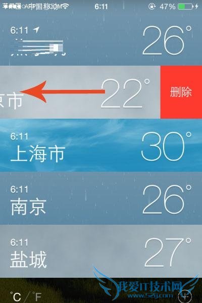 至于删除天气中的城市方法,只需要在城市列表页面,按住需要删除的城市向左滑动,然后点击显示的“删除”按钮,即可。
