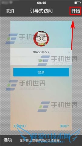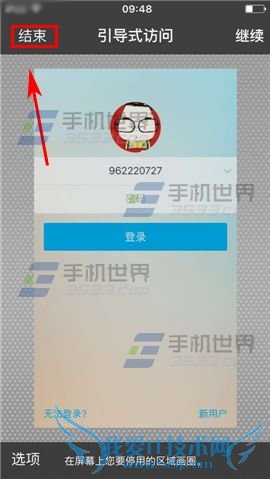 5)打开一个软件,连按三次【主屏幕】按钮后,点击右上角【开始】即可进入引导式访问,如果要退出的话,同样连按三次【主屏幕】按钮,并输入密码,再点击左上角【结束】即可。(如下图)