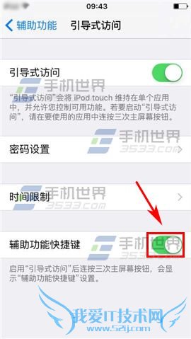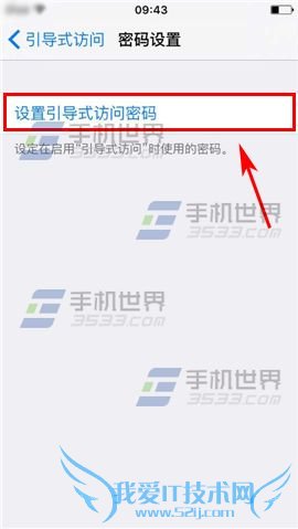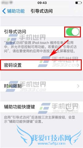 3)现在我们打开【引导式访问】右边滑块,再点击【密码设置】,进入后点击【设置引导式访问密码】。(如下图)