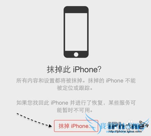最后再点击“抹掉 iPhone”选项,即可通过网络远程发送抹掉所有数据的操作命令。如果此时 iPhone 联网在线的话,它在收到命令以后会自动马上执行。如果 iPhone 没有联网不在线的话,一旦联网以后也会立即执行。