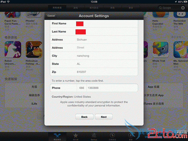 安装提示和要求完善各项信息。如果你需要在美国商店购买应用,那么填入你的支持 VISA 或者 MasterCard 的信用卡信息,如果你只需要下载免费应用使用直接选择【None】。注意 Zip 码的格式为一个数字加一短横线,后面再跟上四个数字。按要求完成后点击【Next】。