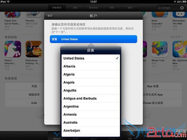 在【店面】中选择你需要使用的国家或地区,一般情况下我们使用【United States】,因为美国的 App Store 一般会提供最全最新的应用。