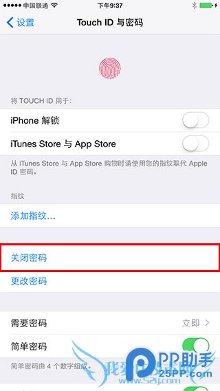 2. 越狱前务必在设备”设置”— ”Touch ID与密码”— ”关闭密码”,关闭锁屏密码。
