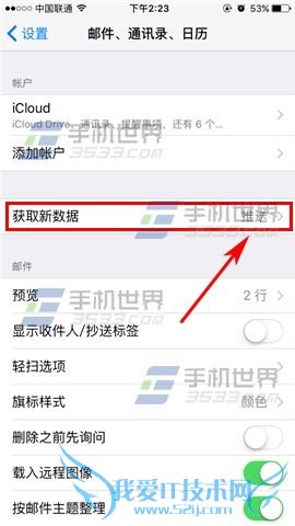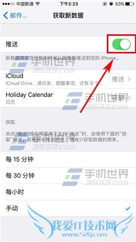 2)打开后我们再点击【获取新数据】,最后将【推送】那栏右边的【椭圆】往左拉即可自动接收邮件了。(如下图)