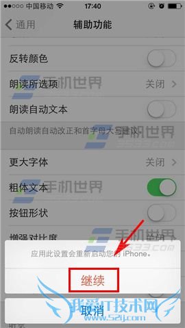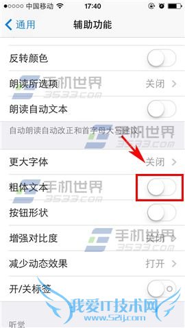 2)在辅助功能界面开启【粗体文本】右边按钮,然后重启iPhone即可。(如下图)
