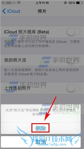 2)接着关闭【我的照片流】右边开关,最后点击【删除】即可。(如下图)