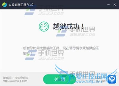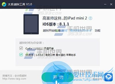 二、下载并打开太极越狱for IOS8版,点击“开始”按钮,程序会自动执行,无需其他操作。越狱时请保持设备连接稳定并耐心等待。