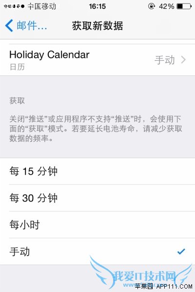 第三步,在“获取新数据”页面,点击开启“推送”功能。在页面最下方,有每15分钟、30分钟、每小时等自动让iPhone检查一次新邮件的设置,但为了省电,用户可以设置为手动来检查新邮件。