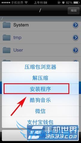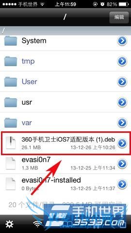 3)打开“iFile”后,在根目录找到“360手机卫士IOS7适配版本”后点击“安装程序”。