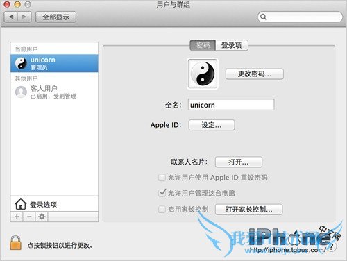 在这里可以设置或修改苹果电脑Mac OS X系统登陆密码