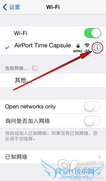 第三步:连接上可用的 Wi-Fi 网络后,然后点击 Wi-Fi 网络名称右方的「显示信息」按钮(字母「i」)。