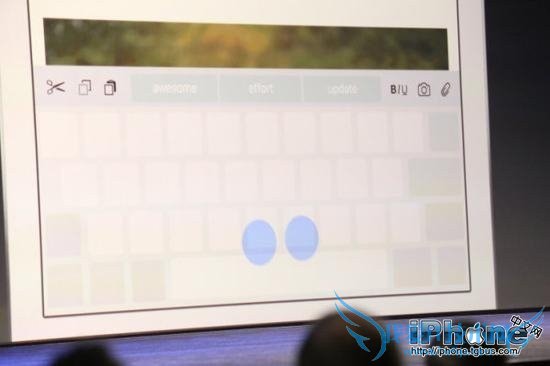 为了让用户在iPad上能更便捷地移动光标,运行iOS9的iPad将可以把键盘当作触控板来用。简单来说,你只要在iPad的键盘上用两支手指并排在键盘上滑动,就可以移动光标了。