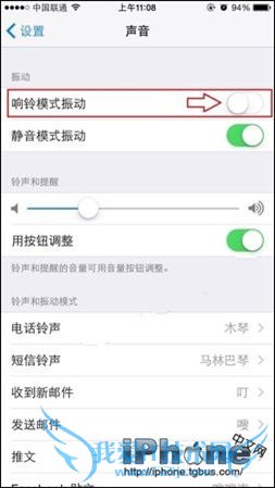 三、在声音设置中,我们只要将【响铃模式振动】开关关闭即可,如下图所示。