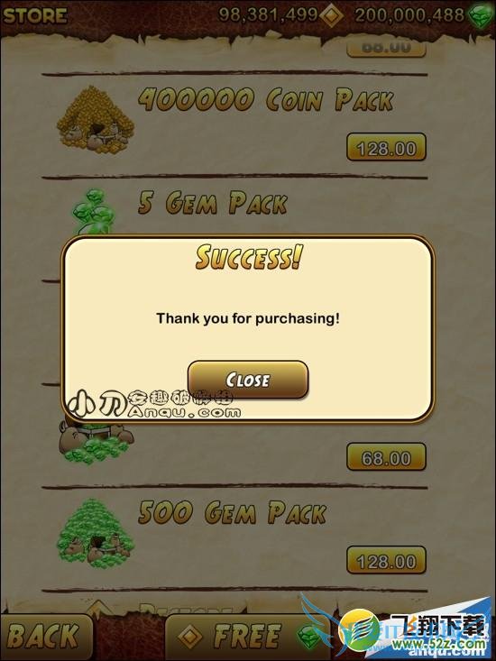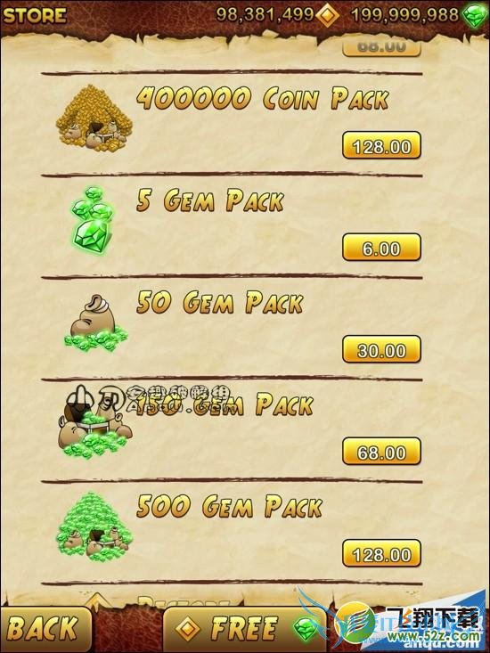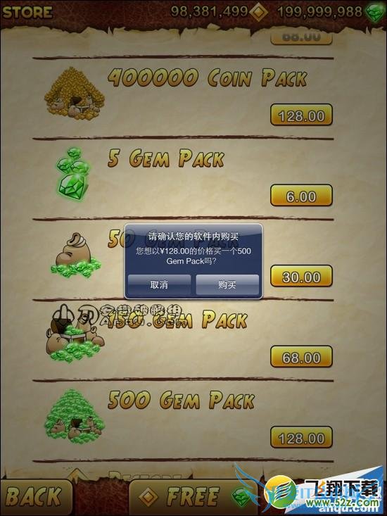 我们以神庙逃亡2这款游戏为例,进行内购,首先进入游戏的商店界面,如下图,发现有很多使用人民币购买钻石的选项,我们直接选择最贵的,也就是那个128元购买500绿宝石的,点击购买: