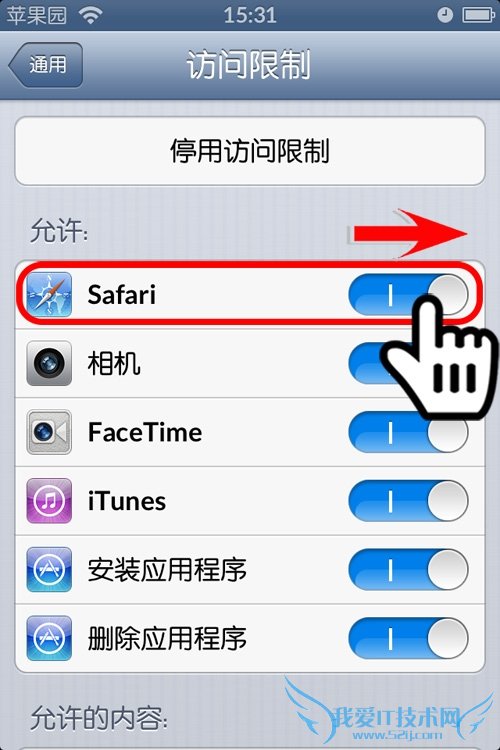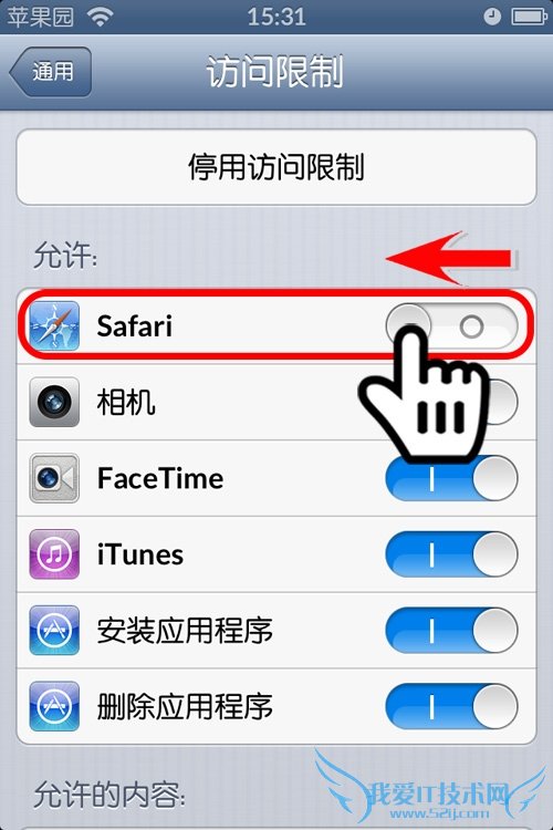 第7步:设置密码成功后,“访问限制”将可以使用,此时主列表中找到隐私项目中的“Safari”,滑动关闭后面的开关;