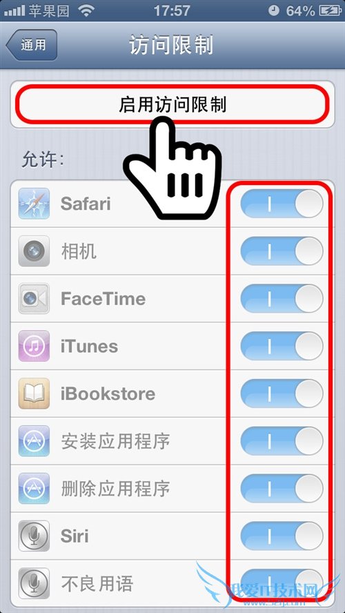 做为一款智能手机,最常用的功能就是上网,很多人都喜欢使用iPhone的自带浏览器进行浏览。不过,苹果没有给Safari设置太多的功能,当你的手机借给其他人时,如果不进行一些限制,被人拿去偷偷上网,那流量费就会暴涨,月底的电话账单会让你很头疼的哦。这时候,我们需要把Safari彻底隐藏掉,让你的朋友不能上网。苹果园为大家详细说明如何隐藏Safari浏览器: