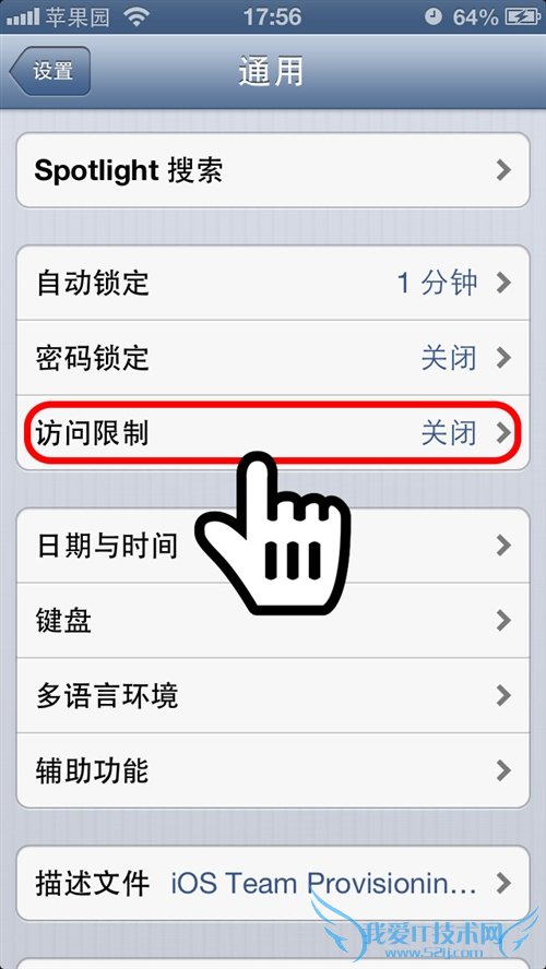 第3步:在“通用”设置中,找到“访问限制”。默认状态下,该项目为关闭状态,接下来我们要把该选项打开才可以使用相应功能。如果您已经打开了“访问限制”,输入密码后请跳到第7步;