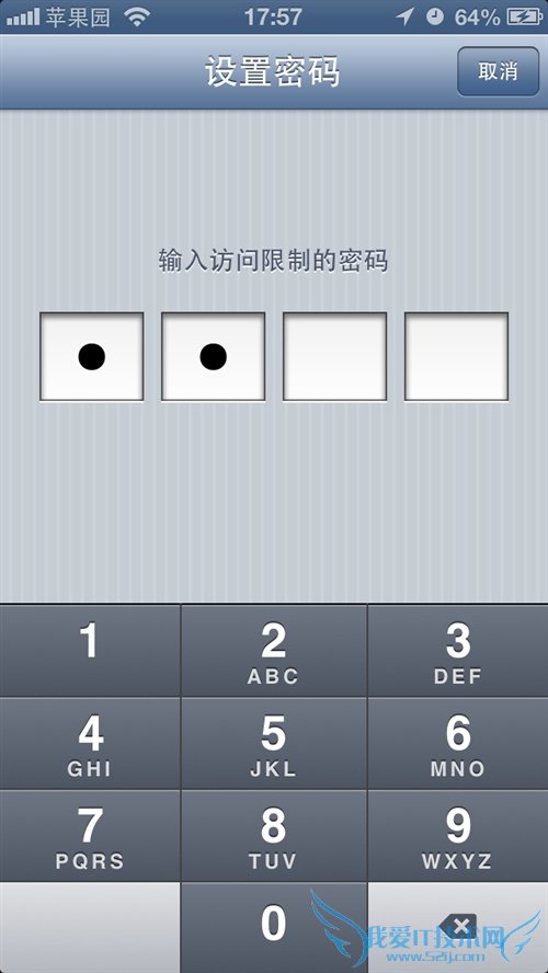 第5步:由于“访问限制”权限很大,将影响到很多重要的设置,所以为了安全起见苹果强制要为其设置四位数字密码。按小键盘可输入密码,为防止旁边有人偷窥,密码在手机上将统一以点显示;