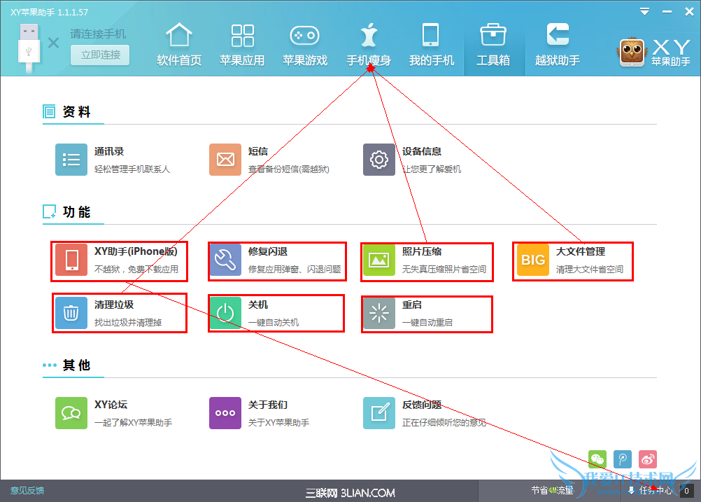 XY苹果助手的工具箱页面分为:资料,功能,其他三部分。资料中包含:通讯录,短信,设备信息。功能中包括:XY苹果助手,修复闪退,照片压缩,大文件清理,清理垃圾,关机,重启。其他中包括:XY苹果助手论坛,关于我们,反馈问题。由此看来,XY苹果助手的工具箱页面更像是一个导航页面,为用户提供所需功能的指引。下面就为大家详细介绍一下这些按钮的具体功能。