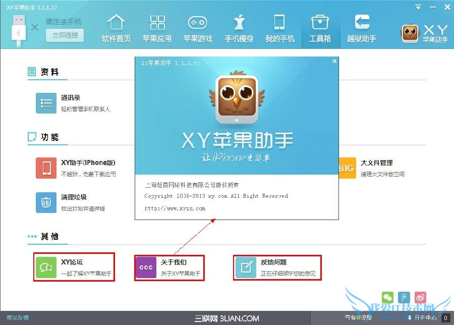 3.点击“XY苹果助手论坛”按钮,会跳转到XY苹果助手论坛,点击“关于我们”按钮,会弹出XY苹果助手的详细信息对话框。点击“反馈问题”按钮,会跳转到XY手机助手网站的“问题反馈”,可以在这里反馈您遇到的问题,我们会尽快处理并给您回复的。