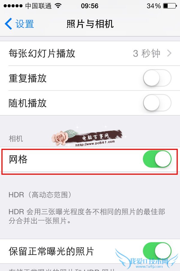 三、然后进入到照片与相机设置界面,找到“网格”一项,点击右方的滑块开启该功能。如下图所示。