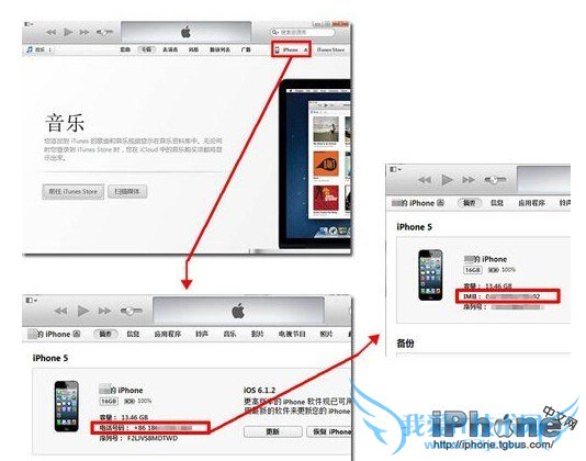 打开itunes,进入你的设备信息,如果没发现IMEI的话,请点击ICCID号或者手机号码,即可看到IMEI号。(具体操作如下图所示,注:点击“电话号码:”后面的你的手机号码,而不是点击“电话号码:”!)