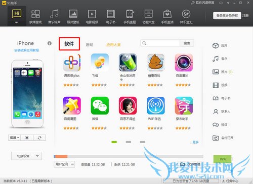 已越狱的设备连接电脑端最新版的91助手,正常显示界面如下: