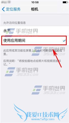 2)接着点击【相机】一栏,进入后选择【使用应用期间】即可。(如下图)