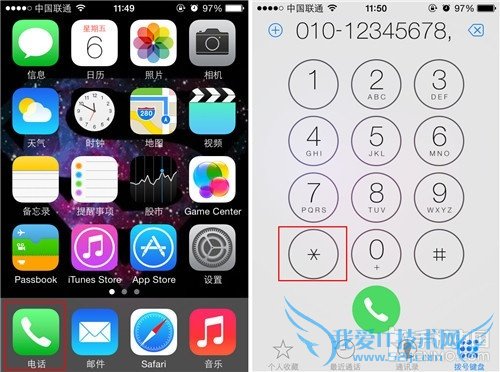 第一步:打开iPhone手机中的虚拟拨号键盘之后输入要拨打的主机号码,然后长按左下角的“*”号键,这时我们会发现在数字的后方会出现一个“,”号。