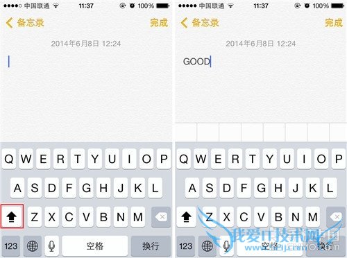 第三步:这时我们随便找一个设备来进行测试,笔者用的是备忘录,在备忘录中如果我们要连续输入大写字母,我们只需要连续按两下向上箭头,就可以实现大写字母锁定功能,连续输入大写字母了。
