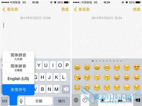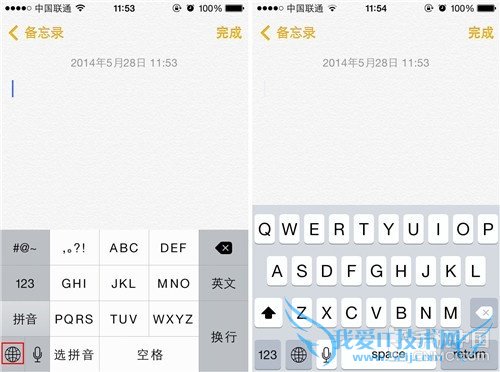 第四步:既然是要输入表情符号,那么我们就要打开短息或者备忘录界面,这里笔者选择用备忘录来做测试,首先用户打开备忘录并调出虚拟键盘,之后 用户需要长按左下角的小地球图标来切换输入法,点击之后系统就会显示出切换选项,用户可切换至简体拼音(全键盘)、简体拼音(九宫格)、简体手写、 English、表情符号等。