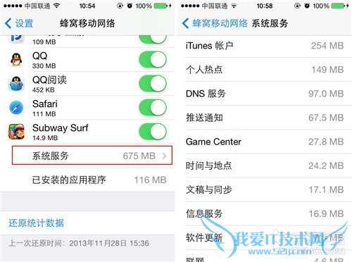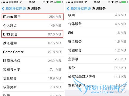 第六步:另外细心的用户会发现在菜单的最底部有一个“系统服务”选项,这个选项是提示我们iOS设备使用流量的情况。点击进入之后我们就可以查看每一个系统服务使用流量的情况,如测试机提示“iTunes账户”、“DNS服务”、“时间与地点”等是流量消耗比较多的。