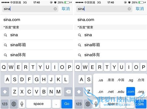 第一步:我们要打开Siri浏览器,然后输入想到登陆的网址,笔者在这里输入的是“sina.com”,不过大家习惯的操作步骤是全部输入,包 括Url后缀,但是今天我们却只要把键盘切换到全字母键盘,然后长按句号按键,就可以在句号上方看到iOS 7系统为用户提供的URL后缀选项了。