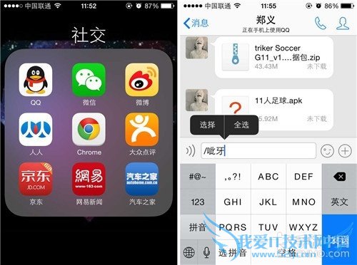 第一步:我们要在iPhone手机中装一个QQ聊天工具,之后打开QQ聊天窗口,点击右侧的表情图标,之后随便选择一个表情,这时在输入栏中就会显示该表情的文字描述,比如“呲牙”表情,就会显示“/呲牙”,之后我们要长按“/呲牙”图标,点击全选并拷贝内容。